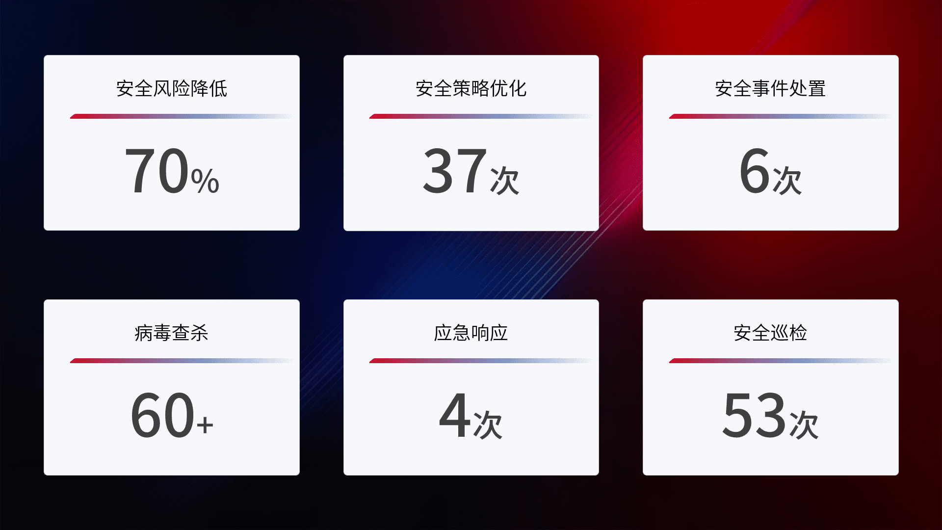 提供全面的安全事件报告体系,,,包括处置报告、、、周报、、、、季度和年度总结,,,,结合持续监控,,,帮助客户深入了解网络安全状况。。。