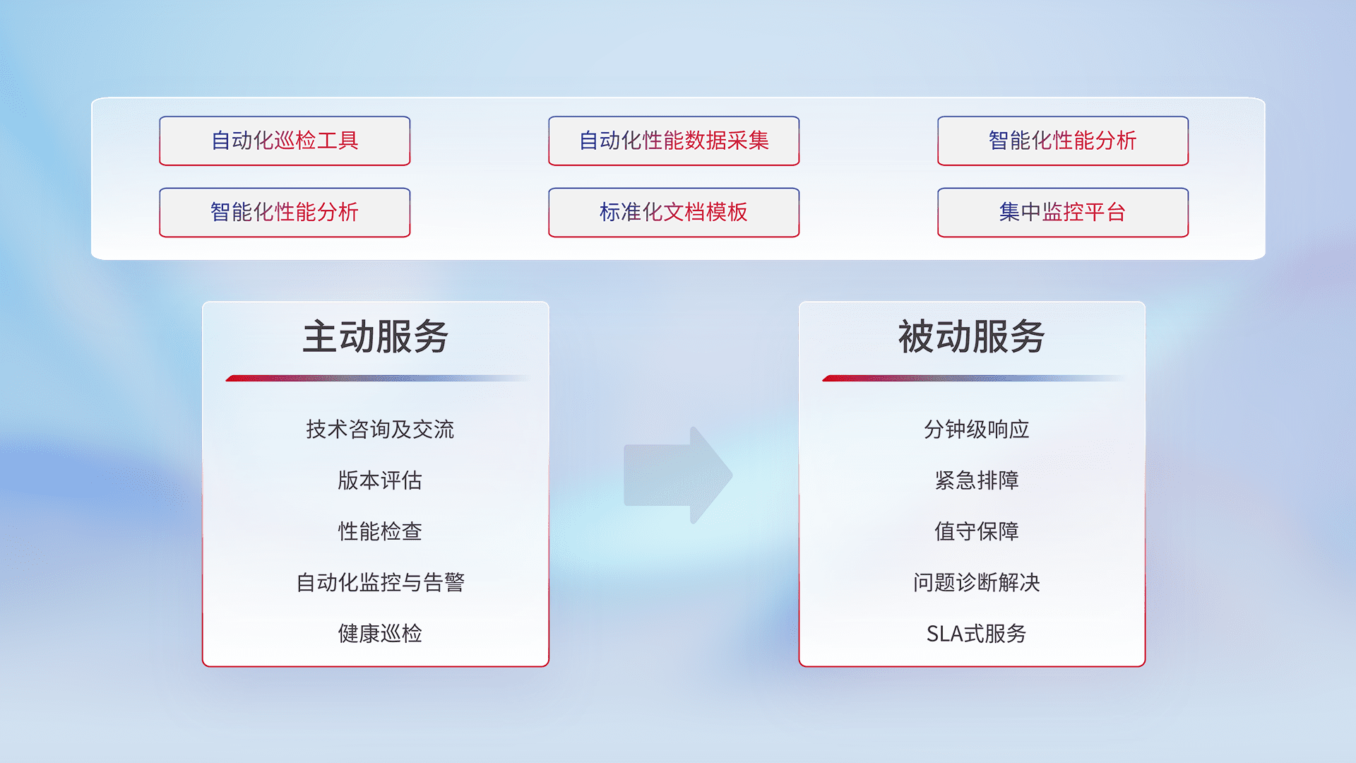 智能化工具和标准化文档,,,,保障服务质量,,提供主动服务(包含技术咨询、、版本评估、、、性能检查、、、自动化监控与告警、、、、健康巡检)和被动服务包含(分钟级响应、、紧急排障、、、、值守保障、、、、问题诊断解决、、、、SLA服务)。。。。