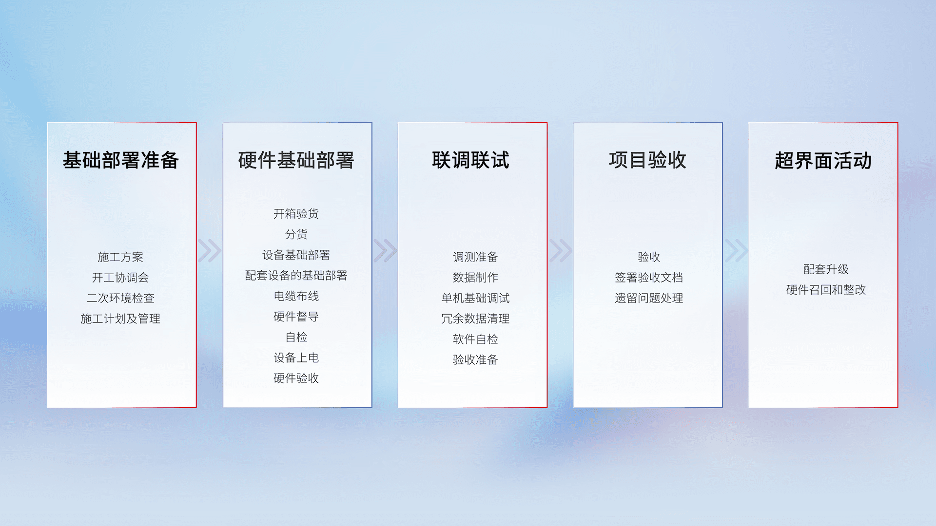 从基础部署准备、、、硬件基础部署、、联调联试、、、、项目验收、、、、越界面活动的全过程可追溯,,,保证施工质量和进度。。。。